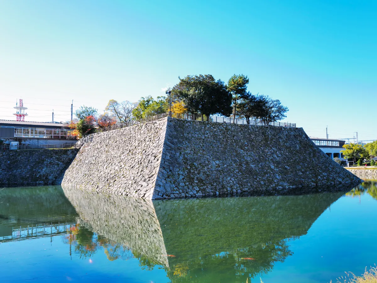 乗り換えの待ち時間が、ちょっとした観光時間に変わります。駅構内から階段を上がるだけで天主台に立て、透明な堀の水を泳ぐ大きな錦鯉を真上から眺められます。新幹線が頭上を通過する瞬間も目の前で体験でき、他では味わえない「駅と城跡」の組み合わせを楽しめます。石垣を下から見上げる角度と天主台から見下ろす角度、両方で味わえるので短時間でも上と下、違う景色に出会えます。夜22時まで開いていてライトアップもされるため、遅い時間でもベンチで一息つけるのも嬉しいところです。