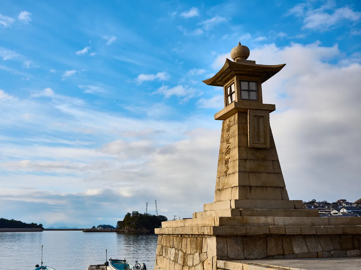 江戸時代の港湾施設と町家が現存する港町です。常夜燈のある港から坂道を上ると、瀬戸内海と島々が見渡せる場所があります。